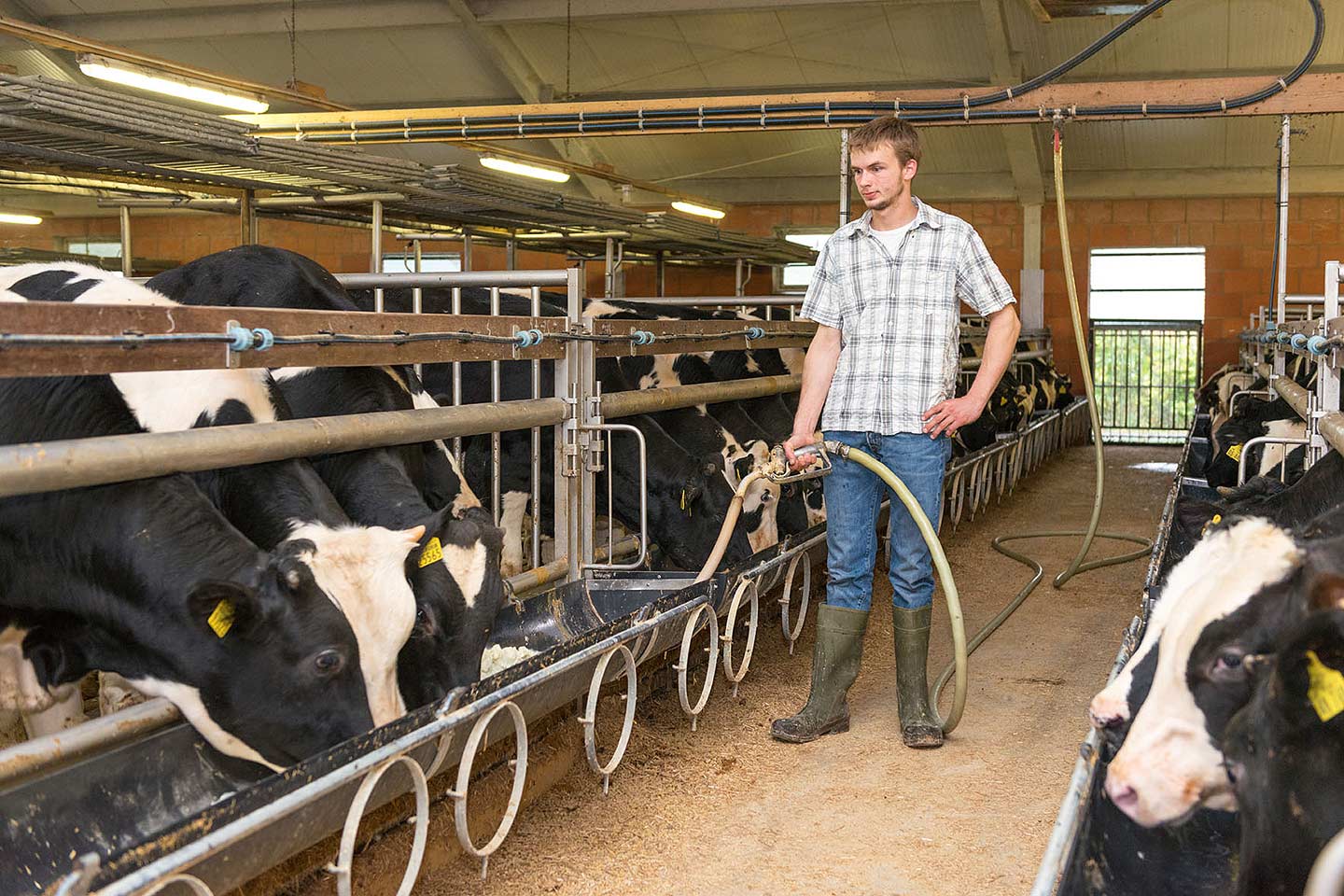 Die 450 Tiere leben in zwei Stallabteilen und haben ein unterschiedliches Alter. Sie leben in Gruppen zu je sechs Tieren. Die Einzelhaltung wurde in den 1990er Jahren abgeschafft. Nur die ganz kleinen Kälbchen leben die erste Woche in einer Einzelbox. „So kann ich mich besser um das Tier kümmern“, betont Hendrik Göttke. Die Anbindehaltung gibt es aber – im Gegensatz zu anderen europäischen Ländern – nicht mehr.